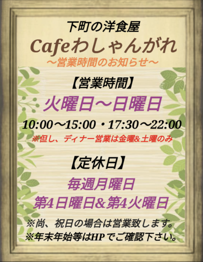 【Cafeわしゃんがれ】ホームページURL&営業日&定休日のお知らせ。