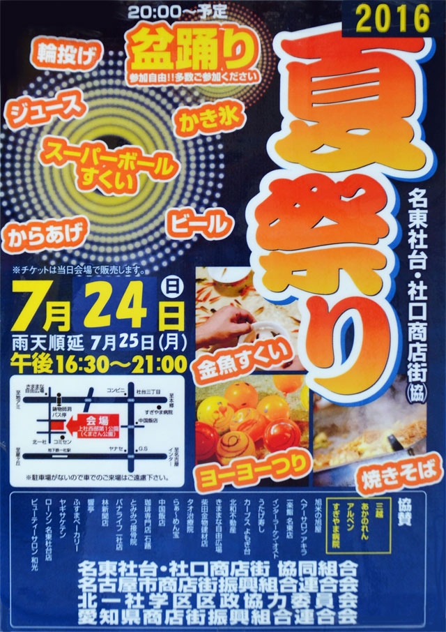 日時:7月24日(日) 午後4時30分~午後9時 (雨天順延・25日) 場所:くまさん公園(上社西部第1公園) ゲームコーナーではスーパーボールすくい、金魚すくい、輪投げ、ヨーヨーつりなど。 唐揚げやかき氷、焼きそば、ジュース、ビールの販売もあります。 20:00頃から盆踊りも開催。