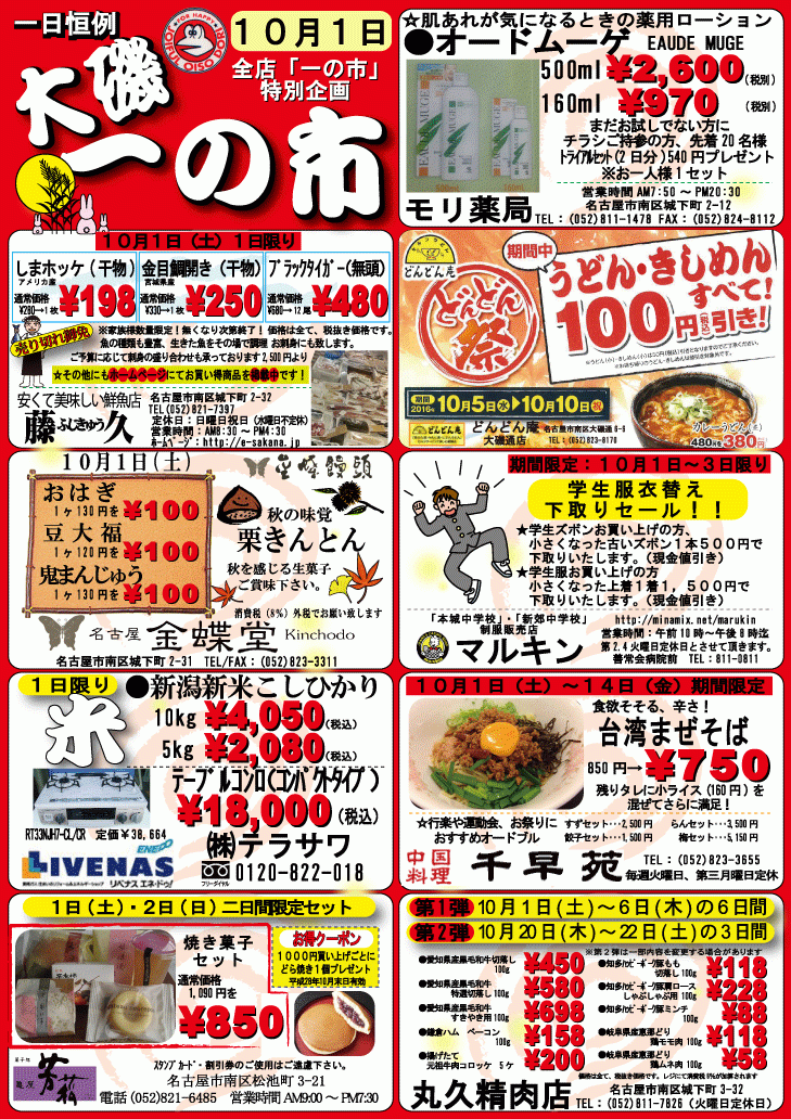 毎月1日大磯一の市を開催いたします。!! 参加店全店で、特別お買い得品を用意して皆様のご来店をお待ちしております。 是非、大磯通へご来店ください。