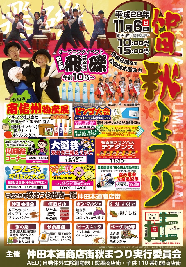 南信州物産展や、五平もち、ポップコーン、フランクフルト、カレー、綿菓子、赤飯、栗大福、あんころ餅、コロッケから揚げなどの模擬店、お楽しみ抽選会などを行います。